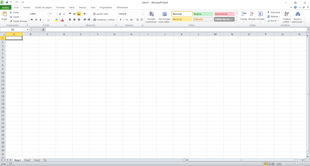 Interfaz básica de Microsoft Excel con filas, columnas y celdas.