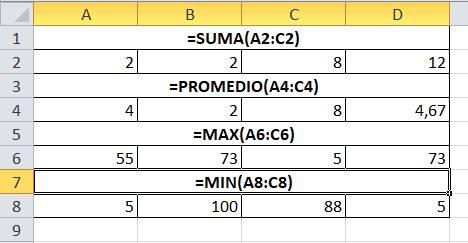 Ejemplo de diferentes fórmulas básicas aplicadas en una hoja de Excel.